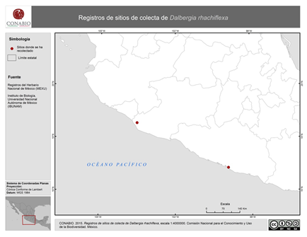 Figura 1. Mapa de registros de colecta históricos de Dalbergia rhachiflexa, escala 1:400 000. Comisión Nacional para el Conocimiento y Uso de la Biodiversidad (2015). Fuente: Registros del Herbario Nacional de México (MEXU) curados por el M. en C. José Linares.